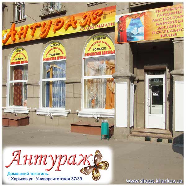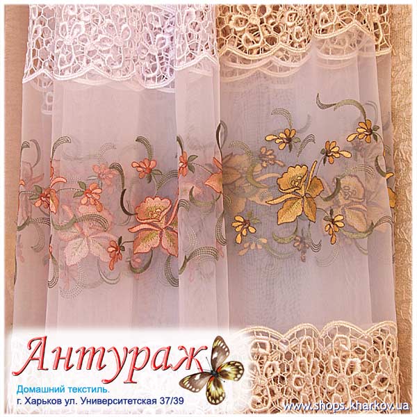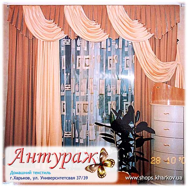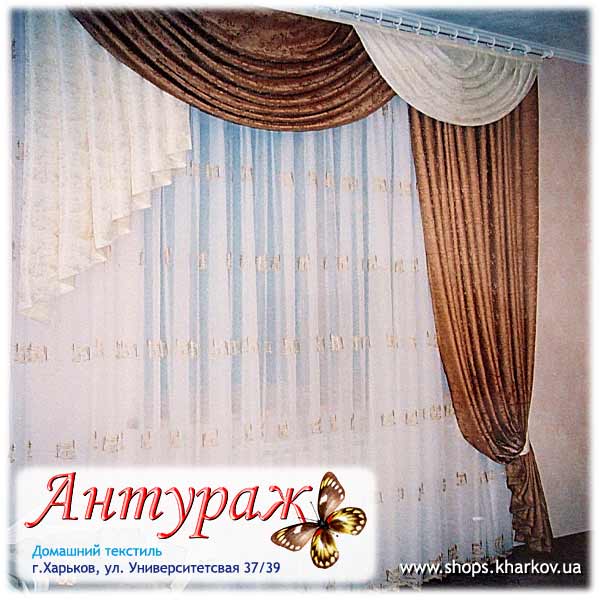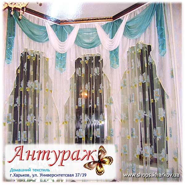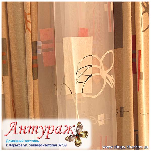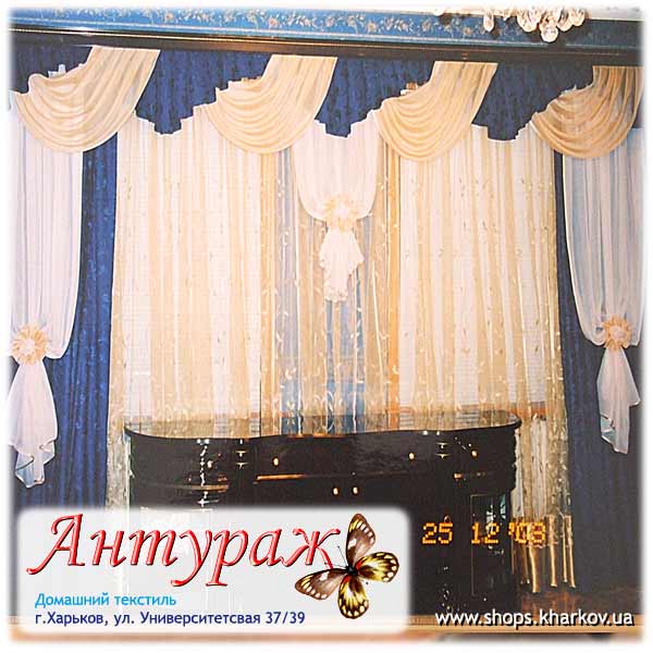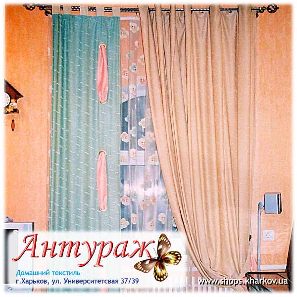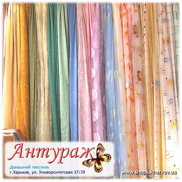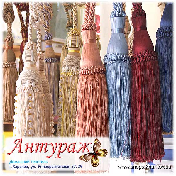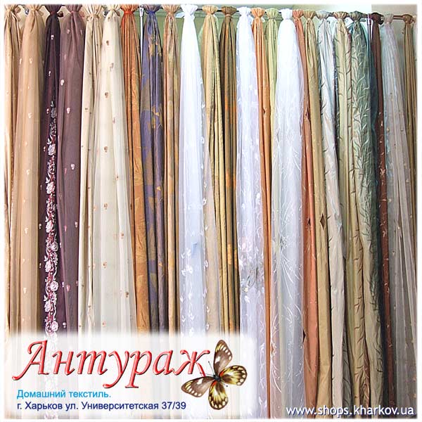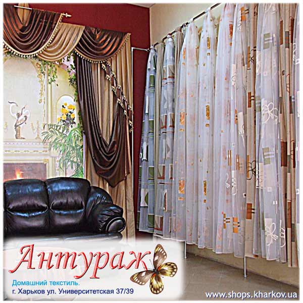 "Антураж", салон-магазин. Шторы и гардины, портьеры, карнизы. Аксессуары для штор, постельное бельё, ламбрикен, бандо, кутассы, кисти для штор. Индивидуальный пошив заказов, дизайн, пошив портьер. Вуаль, органза, шинил, тафта.