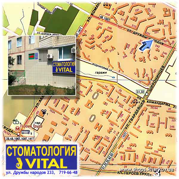ст.м. Героев труда; маршрутка 9т, автобусы 48 и106, троллейбусы 42,31,35 ост. Дружбы народов. Стоматология «Vital»,